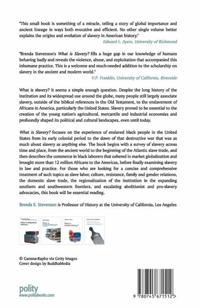 What Is Slavery? focuses on the experience of enslaved black people in the United States from its early colonial period to the dawn of that destructive war that was as much about slavery as anything else. The book begins with a survey of slavery across time and place, from the ancient world to the beginning of the Atlantic slave trade and then describes the commerce in black laborers that ushered in market globalization and brought more than 12 million Africans to the Americas, before finally examining slavery in law and practice.