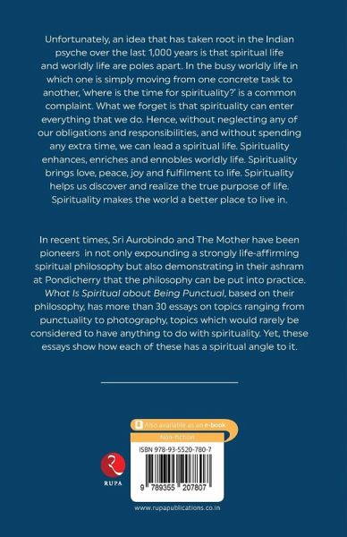 Unfortunately, an idea that has taken root in the Indian psyche over the last 1,000 years is that spiritual life and worldly life are poles apart. In the busy worldly life in which one is simply moving from one concrete task to another, 'where is the time for spirituality?' is a common complaint. What we forget is that spirituality can enter everything that we do. Hence, without neglecting any of our obligations and responsibilities, and without spending any extra time, we can lead a spiritual life. Spirituality enhances, enriches and ennobles worldly life. Spirituality brings love, peace, joy and fulfilment to life. Spirituality helps us discover and realize the true purpose of life. Spirituality makes the world a better place to live in. In recent times, Sri Aurobindo and the Mother have been pioneers in not only expounding a strongly life-affirming spiritual philosophy but also demonstrating in their ashram at Pondicherry that the philosophy can be put into practice. What Is Spiritual about Being Punctual?, based on their philosophy, has more than 30 essays on topics ranging from punctuality to photography, topics which would rarely be considered to have anything to do with spirituality. Yet, these essays show how each of these has a spiritual angle to it.
