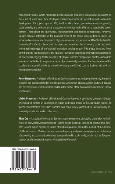 Preface and Acknowledgements - Peter Berglez, Ulrika Olausson, and Mart Ots: What Is Sustainable Journalism? An Introduction - Contributions - Part One: Environment in Focus - Justin Lewis: Quick and Dirty News: The Prospect for More Sustainable Journalism - Richard Maxwell and Toby Miller: Making Journalism Sustainable/Sustaining the Environmental Costs of Journalism - Declan Fahy and Matthew C. Nisbet: The Ecomodernists: Journalists Reimagining a Sustainable Future - Michael Brüggemann: Post-normal Journalism: Climate Journalism and Its Changing Contribution to an Unsustainable Debate - Yan Wah Leung, Edson C. Tandoc Jr., and Shirley S. Ho: Environmental Journalism and Environmental Sustainability in Southeast Asia - Beth Osnes, Rebecca Safran, and Maxwell Boykoff: Student Content Production of Climate Communications - Part Two: Society in Focus - Pieter Maeseele and Daniëlle Raeijmaekers: Journalism and Democracy: Towards a Sustainable Future - Ernesto Abalo: News Journalism for Global Sustainability? On the Problems with Reification and Othering when Reporting on Social Inequality - Ebba Sundin: News-savvy Kids and the Sustainability of Journalism - Susanne M. Almgren: News Users' (Dis)trust in Media Performance: Challenges to Sustainable Journalism in Times of Xenophobia - Mike Gasher: Sustaining Spaces, Patrolling Borders: News Coverage of Migrating Peoples - Stig A. Nohrstedt and Rune Ottosen: Sustainable War Journalism and International Public Law - Part Three: Economy in Focus - C. Ann Hollifield and Laura Schneider: A Global Media Resource Model: Understanding News Media Viability Under Varying Environmental Conditions - Robert G. Picard: Monitoring Media Sustainability: Economic and Business Revisions to Development Indicators - James Breiner: Mapping the World's Digital Media Ecosystem: The Quest for Sustainability - Fredrik Stiernstedt: The Sustainability of Native Advertising: Organizational Perspectives on the Blurring of the Boundary Between Editorial and Commercial Content in Contemporary Media - Naomi Sakr: Managing for Sustainable Journalism Under Authoritarianism: Innovative Business Models Aimed at Good Practice - Anke Trommershausen: Sustainable Journalism? An Approach to New Ethics Management to Achieve Competitive Advantages - Rachel Matthews: The Socio-local Newspaper: Creating a Sustainable Future for the Legacy Provincial News Industry - Victor Pickard: Structural Collapse: The American Journalism Crisis and the Search for a Sustainable Future - Authors.