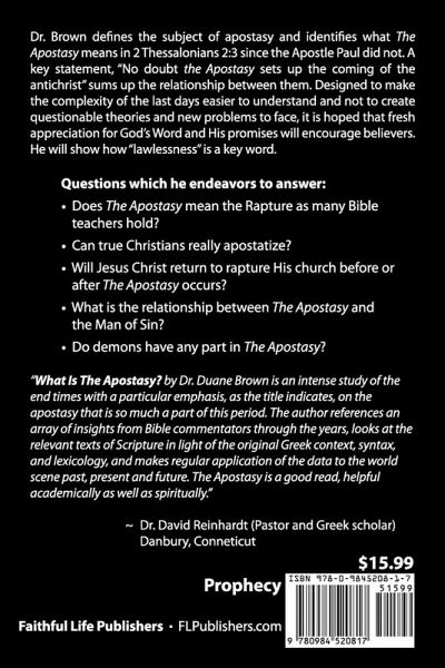 Dr. Brown's book defines the subject of apostasy and identifies what "The Apostasy" means in 2 Thessalonians 2:3 since the Apostle Paul did not. A key statement, "No doubt the Apostasy sets up the coming of the antichrist" sums up the relationship between them. Designed to make the complexity of the last days easier to understand and not to create questionable theories and new problems to face, it is hoped that fresh appreciation for God's Word and His promises will encourage believers. He will show how "lawlessness" is a key word. Questions which he endeavors to answer: - Does "The Apostasy" mean the Rapture as many Bible teachers hold? - Can true Christians really apostatize? - Will Jesus Christ return to rapture His church before or after "The Apostasy" occurs? - What is the relationship between The Apostasy and the Man of Sin? - Do demons have any part in The Apostasy? "The Apostasy by Dr. Duane Brown is an intense study of the end times with a particular emphasis, as the title indicates, on the apostasy that is so much a part of this period. The author references an array of insights from Bible commentators through the years, looks at the relevant texts of Scripture in light of the original Greek context, syntax, and lexicology, and makes regular application of the data to the world scene past, present and future. The Apostasy is a good read, helpful academically as well as spiritually." Dr. David Reinhardt (Pastor and Greek scholar), Danbury, Connecticut