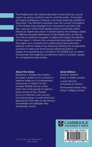 The Middle East has traditionally been understood as a world region by policy, political science, and the public. Its borders are highly ambiguous, however, and rarely explicitly justified or theorized. This Element examines how the current conception of the Middle East emerged from colonialism and the Cold War, placing it within both global politics and trends within American higher education. It demonstrates the strategic stakes of different possible definitions of the Middle East, as well as the internal political struggles to define and shape the identity of the region. It shows how unexamined assumptions about the region as a coherent and unified entity have distorted political science research by arbitrarily limiting the comparative universe of cases and foreclosing underlying politics. It argues for expanding our concept of the Middle East to better incorporate transregional connections within a broader appeal for comparative area studies.