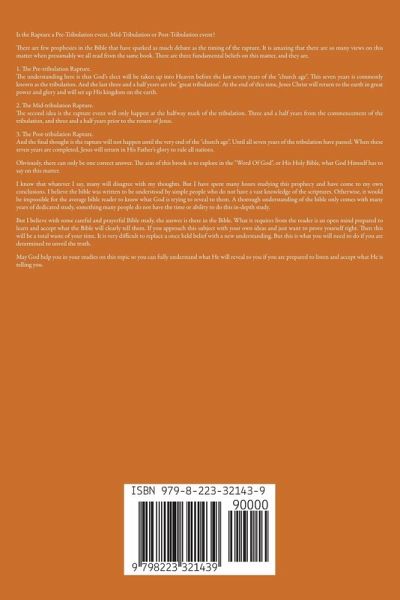 Is the Rapture a Pre-Tribulation event, Mid-Tribulation or Post-Tribulation event? There are few prophesies in the Bible that have sparked as much debate as the timing of the rapture. It is amazing that there are so many views on this matter when presumably we all read from the same book. There are three fundamental beliefs on this matter, and they are. 1. The Pre-tribulation Rapture. The understanding here is that God's elect will be taken up into Heaven before the last seven years of the "church age". This seven years is commonly known as the tribulation. And the last three and a half years are the "great tribulation". At the end of this time, Jesus Christ will return to the earth in great power and glory and will set up His kingdom on the earth. 2. The Mid-tribulation Rapture. The second idea is the rapture event will only happen at the halfway mark of the tribulation. Three and a half years from the commencement of the tribulation, and three and a half years prior to the return of Jesus. 3. The Post-tribulation Rapture. And the final thought is the rapture will not happen until the very end of the "church age". Until all seven years of the tribulation have passed. When these seven years are completed, Jesus will return in His Father's glory to rule all nations. Obviously, there can only be one correct answer. The aim of this brook is to explore in the "Word Of God", or His Holy Bible, what God Himself has to say on this matter. I know that whatever I say, many will disagree with my thoughts. But I have spent many hours studying this prophecy and have come to my own conclusions. I believe the bible was written to be understood by simple people who do not have a vast knowledge of the scriptures. Otherwise, it would be impossible for the average bible reader to know what God is trying to reveal to them. A thorough understanding of the bible only comes with many years of dedicated study, something many people do not have the time or ability to do this in-depth study. But I believe with some careful and prayerful Bible study, the answer is there in the Bible. What it requires from the reader is an open mind prepared to learn and accept what the Bible will clearly tell them. If you approach this subject with your own ideas and just want to prove yourself right. Then this will be a total waste of your time. It is very difficult to replace a once held belief with a new understanding. But this is what you will need to do if you are determined to unveil the truth. May God help you in your studies on this topic so you can fully understand what He will reveal to you if you are prepared to listen and accept what He is telling you.