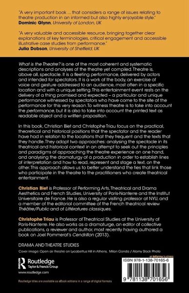 What is the Theatre? is one of the most coherent and systematic descriptions and analyses of the theatre yet compiled. Theatre is, above all, spectacle. It is a fleeting performance, delivered by actors and intended for spectators. It is a work of the body, an exercise of voice and gesture addressed to an audience, most often in a specific location and with a unique setting. This entertainment event rests on the delivery of a thing promised and expected - a particular and unique performance witnessed by spectators who have come to the site of the performance for this very reason. To witness theatre is to take into account the performance, but it is also to take into account the printed text as readable object and a written proposition. In this book, Christian Biet and Christophe Triau focus on the practical, theoretical and historical positions that the spectator and the reader have had in relation to the locations that they frequent and the texts that they handle. They adopt two approaches: analysing the spectacle in its theatrical and historical context in an attempt to seek out the principles and paradigms of approaching the theatre experience on one hand, and analysing the dramaturgy of a production in order to establish lines of interpretation and how to read, represent and stage a text, on the other. This approach allows us to better understand the ties that link those who participate in the theatre to the practitioners who create theatrical entertainment.