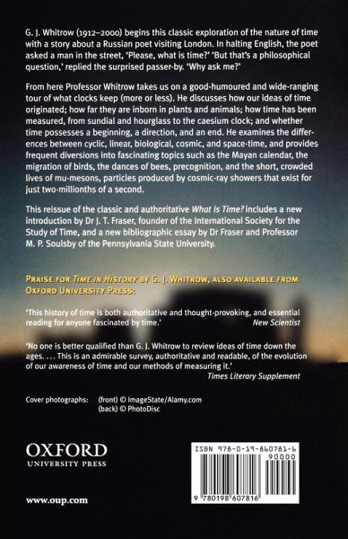 G. J. Whitrow (1912-2000) begins this classic exploration of the nature of time with a story about a Russian poet, visiting London before the First World War. The poet's English was not too good and when he asked a man in the street, 'Please, what is time?' he received the response, 'But that's a philosophical question. Why ask me?'.