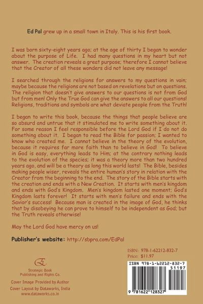 I was born sixty-eight years ago; at the age of thirty I began to wonder about the purpose of Life. I had many questions in my heart but not answer. The creation reveals a great purpose; therefore I cannot believe that the Creator of all these wonders did not leave any message! I searched through the religions for answers to my questions in vain; maybe because the religions are not based on revelations but on questions. The religion that doesn't give answers to our questions is not from God but from men! Only the True God can give the answers to all our questions! Religions, traditions and symbols are what deviate people from the Truth! I began to write this book, because the things that people believe are so absurd and untrue that it stimulated me to write something about it. For some reason I feel responsible before the Lord God if I do not do something about it. I began to read the Bible for passion; I wanted to know who created me. I cannot believe in the theory of the evolution, because it requires far more faith than to believe in God! To believe in God is easy, everything leads to Him; at the contrary nothing leads to the evolution of the species; it was a theory more than two hundred years ago, and will be a theory as long this world lasts! The Bible, besides making people wiser, reveals the entire human's story in relation with the Creator from the beginning to the end. The story of the Bible starts with the creation and ends with a New Creation. It starts with men's kingdom and ends with God's Kingdom. Men's kingdom lasted one moment; God's Kingdom lasts forever! It starts with men's failure and ends with the Savior's success! Because man is created in the image of God, he thinks that by disobeying he can prove to himself to be independent as God; but the Truth reveals otherwise! May the Lord God have mercy on us! Ed Pal grew up in a small town in Italy. This is his first book.