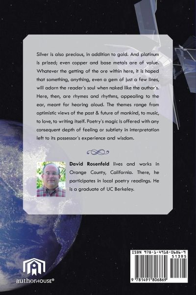 Silver is also precious, in addition to gold. And platinum is prized; even copper and base metals are of value. Whatever the getting of the ore within here, it is hoped that something, anything, even a gem of just a few lines, will adorn the reader's soul when naked like the author's. Here, then, are rhymes and rhythms, appealing to the ear, meant for hearing aloud. The themes range from optimistic views of the past & future of mankind, to music, to love, to writing itself. Poetry's magic is offered with any consequent depth of feeling or subtlety in interpretation left to its possessor's experience and wisdom.