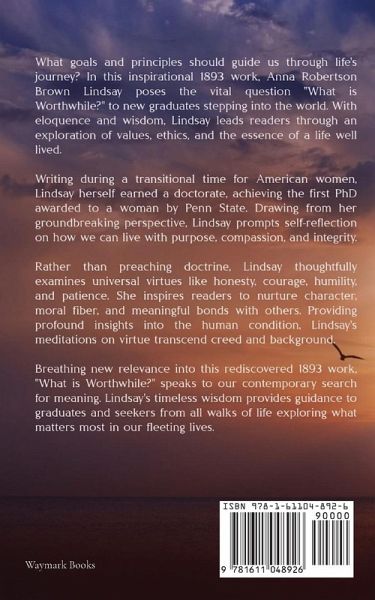 What goals and principles should guide us through life's journey? In this inspirational 1893 work, Anna Robertson Brown Lindsay poses the vital question "What is Worthwhile?" to new graduates stepping into the world. With eloquence and wisdom, Lindsay leads readers through an exploration of values, ethics, and the essence of a life well lived. Writing during a transitional time for American women, Lindsay herself earned a doctorate, achieving the first PhD awarded to a woman by Penn State. Drawing from her groundbreaking perspective, Lindsay prompts self-reflection on how we can live with purpose, compassion, and integrity. Rather than preaching doctrine, Lindsay thoughtfully examines universal virtues like honesty, courage, humility, and patience. She inspires readers to nurture character, moral fiber, and meaningful bonds with others. Providing profound insights into the human condition, Lindsay's meditations on virtue transcend creed and background. Breathing new relevance into this rediscovered 1893 work, "What is Worthwhile?" speaks to our contemporary search for meaning. Lindsay's timeless wisdom provides guidance to graduates and seekers from all walks of life exploring what matters most in our fleeting lives.