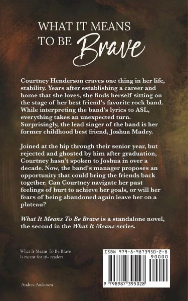 Courtney Henderson craves one thing in her life, stability. Years after establishing a career and home that she loves, she finds herself sitting on the stage of her best friend's favorite rock band. While interpreting the band's lyrics to ASL, everything takes an unexpected turn. Surprisingly, the lead singer of the band is her former childhood best friend, Joshua Madey. Joined at the hip through their senior year, but rejected and ghosted by him after graduation, Courtney hasn't spoken to Joshua in over a decade. Now, the band's manager proposes an opportunity that could bring the friends back together. Can Courtney navigate her past feelings of hurt to achieve her goals, or will her fears of being abandoned again leave her on a plateau? What It Means To Be Brave is a standalone novel, the second in the What It Means series.