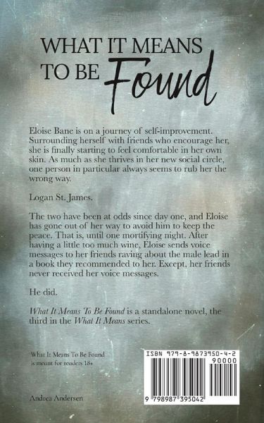 Eloise Bane is on a journey of self-improvement. Surrounding herself with friends who encourage her, she is finally starting to feel comfortable in her own skin. As much as she thrives in her new social circle, one person in particular always seems to rub her the wrong way. Logan St. James. The two have been at odds since day one, and Eloise has gone out of her way to avoid him to keep the peace. That is, until one mortifying night. After having a little too much wine, Eloise sends voice messages to her friends raving about the male lead in a book they recommended to her. Except, her friends never received her voice messages. He did. What It Means To Be Found is a standalone novel, the third in the What It Means series.