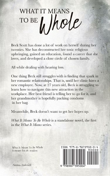 Beck Scott has done a lot of work on herself during her twenties. She has deconstructed her toxic religious upbringing, gained an education, found a career that she loves, and developed a close circle of chosen family. All while dealing with hearing loss. One thing Beck still struggles with is finding that spark in her romantic relationships. That is, until her clinic hires a new employee. Now, at 27 years old, Beck is struggling to learn how to navigate her new attraction in the workplace. Her best friend is telling her to go for it, and her grandmother is hopefully packing condoms in her bag. Meanwhile, Beck doesn't want to get her hopes up. What It Means To Be Whole is a standalone novel, the first in the What It Means series