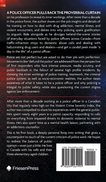 A police officer pulls back the proverbial curtain on his profession to reveal its inner workings. After more than a decade in the police force, the author shares on-the-job insights and details of his training on how to deal with drug addiction, mental illness, and violent encounters, and delves into why policing spans gratification to anguish. Ride alongside as he divulges behind-the-scene stories of everyday situations faced by police officers across Canada-from traffic-infraction stops to domestic abuse calls and dealing with hallucinating drug users and dealers-and get a candid peek inside "a day in the life" of a patrol officer. Police are not perfect but are asked to do their job with perfection. Movements like "defund the police" are addressed from the perspective of first responders who face intense pressure, media scrutiny, and public backlash in the fallout of several high profile incidents. By showing the inner workings of police training, teamwork, the criminal justice system, as well as socio-economic realities, the author raises awareness of what it takes to be a police officer and why policing is integral to public safety, while also questioning the current stigma against law enforcement.