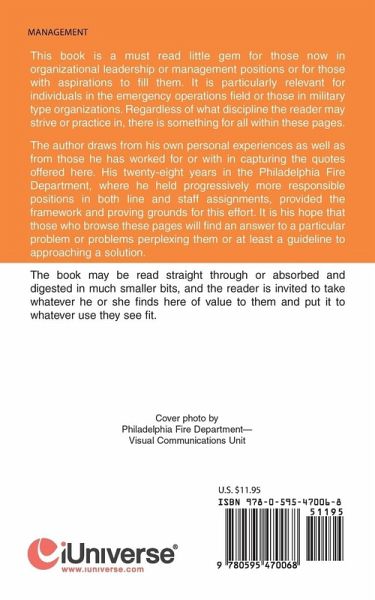This book is a must read little gem for those now in organizational leadership or management positions or for those with aspirations to fill them. It is particularly relevant for individuals in the emergency operations field or those in military type organizations. Regardless of what discipline the reader may strive or practice in, there is something for all within these pages. The author draws from his own personal experiences as well as from those he has worked for or with in capturing the quotes offered here. His twenty-eight years in the Philadelphia Fire Department, where he held progressively more responsible positions in both line and staff assignments, provided the framework and proving grounds for this effort. It is his hope that those who browse these pages will find an answer to a particular problem or problems perplexing them or at least a guideline to approaching a solution. The book may be read straight through or absorbed and digested in much smaller bits, and the reader is invited to take whatever he or she finds here of value to them and put it to whatever use they see fit.