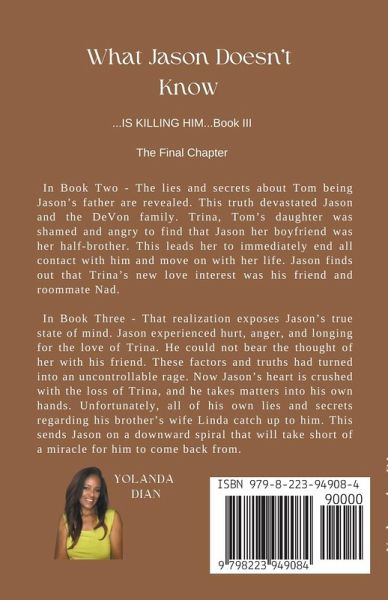 In Book Two - The lies and secrets about Tom being Jason's father are revealed. This truth devastated Jason and the DeVon family. Trina, Tom's daughter was shamed and angry to find that Jason her boyfriend was her half-brother. This leads her to immediately end all contact with him and move on with her life. Jason finds out that Trina's new love interest was his friend and roommate Nad. In Book Three - That realization exposes Jason's true state of mind. Jason experienced hurt, anger, and longing for the love of Trina. He could not bear the thought of her with his friend. These factors and truths had turned into an uncontrollable rage. Now Jason's heart is crushed with the loss of Trina, and he takes matters into his own hands. Unfortunately, all of his own lies and secrets regarding his brother's wife Linda catch up to him. This sends Jason on a downward spiral that will take short of a miracle for him to come back from.