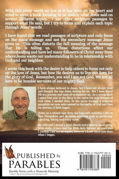 With this crazy world we live in it has been on my heart and mind to write a book focusing in on mainly what Jesus said on several different topics. I use other scripture passages to support what He said, but I try to focus and explain each topic through Jesus' words. I have found that we read passages of scripture and only focus on the main message and not the secondary message Jesus gives us. This often distorts the full meaning of the message that He is telling us. These distortions affect our understanding and have led many followers of Christ away from where Jesus wants our understanding to be in relationship with God and our neighbor. I wrote this book with the desire to help others to focus not only on the love of Jesus, but how He desires us to live our lives for the glory of God. Remember, you and I are not God. We are all here to be humble servants of our mighty God. BIO I have always believed in Jesus, but I have not always lived and thought the way Jesus desires for us. But I have found life is a journey and none of us measure up. As a young adult I spent four year in the Navy in the 1960s but only thought of God when I needed Him. In the 1970s through a religious pamphlet my eyes were opened to the reality of God and then my journey of faith began. Today as a retired man from the high tech industry, I live in New Hampshire and do many activities such as gardening, kayaking, hiking and many more. ¿