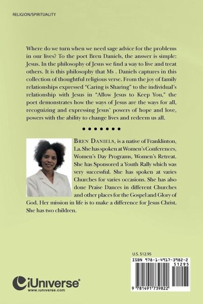 Where do we turn when we need sage advice for the problems in our lives? To the poet Bren Daniels, the answer is simple: Jesus. In the philosophy of Jesus we find a way to live and treat others. It is this philosophy that Ms . Daniels captures in this collection of thoughtful religious verse. From the joy of family relationships expressed ?Caring is Sharing? to the individual?s relationship with Jesus in ?Allow Jesus to Keep You,? the poet demonstrates how the ways of Jesus are the ways for all, recognizing and expressing Jesus? powers of hope and love, powers with the ability to change lives and redeem us all.