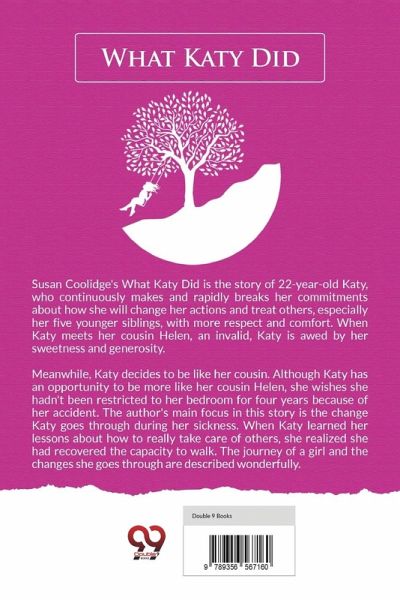 Susan Coolidge's What Katy Did is the story of 22-year-old Katy, who continuously makes and rapidly breaks her commitments about how she will change her actions and treat others, especially her five younger siblings, with more respect and comfort. When Katy meets her cousin Helen, an invalid, Katy is awed by her sweetness and generosity. Meanwhile, Katy decides to be like her cousin. Although Katy has an opportunity to be more like her cousin Helen, she wishes she hadn't been restricted to her bedroom for four years because of her accident. The author's main focus in this story is the change Katy goes through during her sickness. When Katy learned her lessons about how to really take care of others, she realized she had recovered the capacity to walk. The journey of a girl and the changes she goes through are described wonderfully.