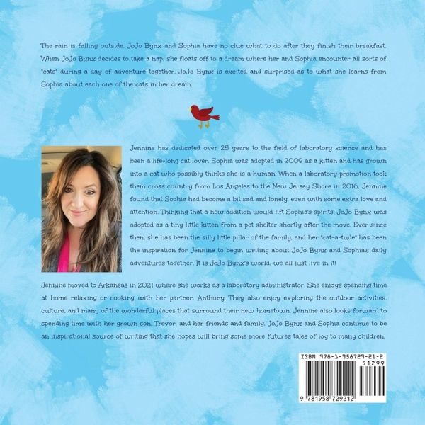 The rain is falling outside. JoJo Bynx and Sophia have no clue what to do after they finish their breakfast. When JoJo Bynx decides to take a nap, she floats off to a dream where her and Sophia encounter all sorts of "cats" during a day of adventure together. JoJo Bynx is excited and surprised as to what she learns from Sophia about each one of the cats in her dream. Jennine has dedicated over 25 years to the field of laboratory science and has been a life-long cat lover. Sophia was adopted in 2009 as a kitten and has grown into a cat who possibly thinks she is a human. When a laboratory promotion took them cross country from Los Angeles to the New Jersey Shore in 2016, Jennine found that Sophia had become a bit sad and lonely, even with some extra love and attention. Thinking that a new addition would lift Sophia's spirits, JoJo Bynx was adopted as a tiny little kitten from a pet shelter shortly after the move. Ever since then, she has been the silly little pillar of the family, and her "cat-a-tude" has been the inspiration for Jennine to begin writing about JoJo Bynx and Sophia's daily adventures together. It is JoJo Bynx's world; we all just live in it! Jennine moved to Arkansas in 2021 where she works as a laboratory administrator. She enjoys spending time at home relaxing or cooking with her partner, Anthony. They also enjoy exploring the outdoor activities, culture, and many of the wonderful places that surround their new hometown. Jennine also looks forward to spending time with her grown son, Trevor, and her friends and family. JoJo Bynx and Sophia continue to be an inspirational source of writing that she hopes will bring some more futures tales of joy to many children.