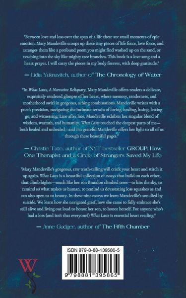 "Mary Mandeville's gorgeous, raw truth-telling will crack your heart and stitch it up again. WHAT LASTS is a beautiful collection of essays that build on each other, that climb higher-much like her son Brandon climbed trees-to kiss the sky, to remind us what makes us human, to remind us devastating loss squashes us and can also open us to beauty. In these nine essays we learn Mandeville's son died by suicide. We learn how she navigated grief, how she came to fully embrace she's still alive and living out loud to honor her son, to honor herself. For anyone who's had a loss (and isn't that everyone?) WHAT LASTS is essential heart reading." - Anne Gudger, author of THE FIFTH CHAMBER / "Between love and loss over the span of a life there are small moments of epic emotion. Mary Mandeville scoops up these tiny pieces of life force, love force, and arranges them like a profound poem you might find washed up on the sand, or reaching into the sky like mighty tree branches. This book is a love song and a heart prayer. I will carry the pieces in my body forever, with deep gratitude." - Lidia Yuknavitch, author of THE CHRONOLOGY OF WATER / "In WHAT LASTS, A Narrative Reliquary, Mary Mandeville offers readers a delicate, exquisitely rendered glimpse of her heart, where memory, tenderness, and motherhood swirl in gorgeous, aching combinations. Mandeville writes with a poet's precision, navigating the intimate terrain of loving, healing, losing, letting go, and witnessing. Line after line, Mandeville exhibits her singular blend of wisdom, warmth, and humanity. WHAT LASTS touched the deepest parts of me-both healed and unhealed-and I'm grateful Mandeville offers her light to all of us through these beautiful pages." - Christie Tate, author of NYT bestseller GROUP: HOW ONE THERAPIST AND A CIRCLE OF STRANGERS SAVED MY LIFE