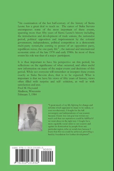 Dr.Siaka Probyn Stevens was the third Prime Minister of Sierra Leone from 1967 to 1971 and the first Executive president of Sierra Leone from 1971 to 1986. Siaka Stevens died on May 29th 1988. May His Soul continue to rest in peace. In 1985,Dr. Siaka Probyn Stevens published his Autobiography- 'What Life Has Taught Me'. What Life Has Taught Me is in part a political history of Sierra Leone and in part the story of a self-made man. This is a republication of the autobiography, which comes in two parts. Part I covers his political career and his role in shaping the political landscape of modern Sierra Leone. There is much in these pages to interest anyone. This book is important in because it reveals much more than the life of Siaka Stevens. It is also about the process of development, decolonization, and the dynamics of nation building.
