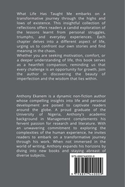 In "What Life Has Taught Me," Anthony Ekanem distils a lifetime of experiences into profound insights, sharing a heartfelt and honest reflection on the lessons learned through the trials and triumphs of everyday life. This engaging non-fiction book takes readers through the pivotal moments that shaped the author's perspective, exploring themes of resilience, love, loss, and self-discovery. Drawing from personal anecdotes and universal truths, the book invites readers to contemplate their life experiences. Each chapter delves into a specific lesson, offering practical wisdom and actionable advice that resonates across diverse backgrounds and circumstances. Whether it's navigating the complexities of relationships, overcoming adversity, or finding purpose in uncertain times, "What Life Has Taught Me" serves as both a memoir and a guide, encouraging readers to reflect on their paths. With warmth and sincerity, Anthony Ekanem reminds readers that life's most valuable lessons often come from the least expected places. This book is not just a recounting of experiences; it is an empowering call to embrace growth, cherish connections, and live authentically. "What Life Has Taught Me" is for anyone seeking inspiration and clarity on their journey, making it a must-read for those ready to transform their challenges into steppingstones towards a fuller and more meaningful life.