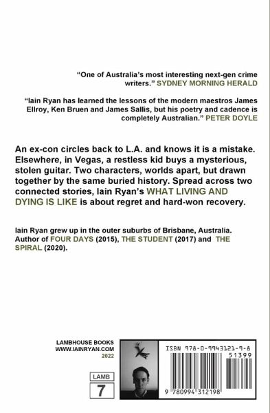 "One of Australia's most interesting next-gen crime writers." SYDNEY MORNING HERALD "Iain Ryan has learned the lessons of the modern maestros James Ellroy, Ken Bruen and James Sallis, but his poetry and cadence is completely Australian." PETER DOYLE An ex-con circles back to L.A. and knows it is a mistake. Elsewhere, in Vegas, a restless kid buys a mysterious, stolen guitar. Two characters, worlds apart, but drawn together by the same buried history. Spread across two connected stories, Iain Ryan's What Living And Dying Is Like is about regret and hard-won recovery. Iain Ryan grew up in the outer suburbs of Brisbane, Australia. Author of FOUR DAYS (2015), THE STUDENT (2017) and THE SPIRAL (2020).