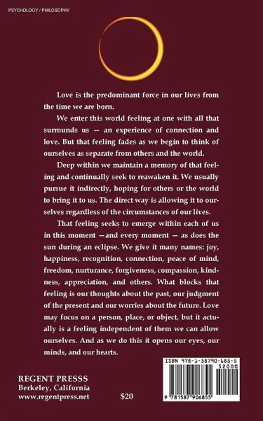 Love is the predominant force in our lives from the time we are born.We enter this world feeling at one with all that surrounds us - an experience of connection and love. But that feeling fades as we begin to think of ourselves as separate from others and the world. Deep within we maintain a memory of that feeling and continually seek to reawaken it. We usually pursue it indirectly, hoping for others or the world to bring it to us. The direct way is allowing it to ourselves regardless of the circumstances of our lives.That feeling seeks to emerge within each of us in this moment -and every moment - as does the sun during an eclipse. We give it many names: joy, happiness, recognition, connection, peace of mind, freedom, nurturance, forgiveness, compassion, kindness, appreciation, among others. What blocks that feeling is our thoughts about the past, our judgment of the present and our worries about the future. Love may focus on a person, place, or object, but it actually is a feeling independent of them we can decide to allow ourselves. And as we do this it opens our eyes, our minds, and our hearts.