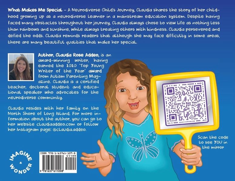 Claudia Addeo is an award-winning Writer, Certified Teacher, Doctoral Student, and Neurodiverse Advocate.After being evaluated and diagnosed as learning disabled at a very early age, Claudia chose to dedicate her career to writing and speaking about the obstacles she has faced throughout her journey, as well as how she has overcome many of them. Her intention in sharing her journey is to give hope to both parents and children that their journey can get better over time.