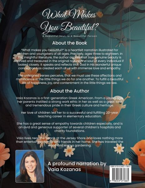 "What makes you beautiful?" is a heartfelt narration illustrated for children and youngsters of all ages. Precisely, ages three to eighteen. In this insightful literature, the author aspires that true genuine beauty is carved and treasured in the original nature and soul of every individual if looked closely. It speaks and reflects that God in His wonderful unique conception has created each of us with immense love and empathy. The unfeigned verses perceive, that we must use these affections and munificence in the little things we do for one another. To fulfill a beautiful life of happiness, joy, and contentment in the little things we see.
