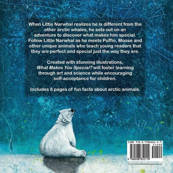 When Little Narwhal realizes he is different from the other arctic whales, he sets out on an adventure to discover what makes him special. Follow Little Narwhal as he meets Puffin, Moose and other unique animals who teach young readers that they are perfect and special just the way they are. Created with stunning illustrations, What Makes You Special? will foster learning through art and science while encouraging self-acceptance for children. Includes 8 pages of fun facts about arctic animals.