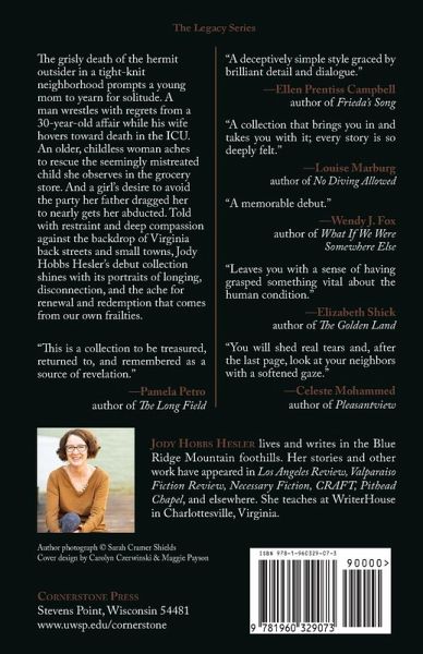 The grisly death of the hermit outsider in a tight-knit neighborhood prompts a young mom to yearn for solitude. A man wrestles with regrets from a 30-year-old affair while his wife hovers toward death in the ICU. An older, childless woman aches to rescue the seemingly mistreated child she observes in the grocery store. And a girl's desire to avoid the party her father dragged her to nearly gets her abducted. Told with restraint and deep compassion against the backdrop of Virginia back streets and small towns, Jody Hobbs Hesler's debut collection shines with its portraits of longing, disconnection, and the ache for renewal and redemption that comes from our own frailties.
