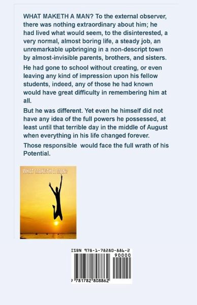 WHAT MAKETH A MAN? To the external observer, there was nothing extraordinary about him; he had lived what would seem, to the disinterested, a very normal, almost boring life, a steady job, an unremarkable upbringing in a non-descript town by almost-invisible parents, brothers, and sisters. He had gone to school without creating, or even leaving any kind of impression upon his fellow students, indeed, any of those he had known would have great difficulty in remembering him at all. But all this was part of his skill and subtle strength. Although he had known immediately he was different in some way, right from his very smallest beginnings, he had the innate sense to realise that he had to hide his true self, blend in, keep a low profile at all times, for he knew that the outsider in society is never made welcome, that he would easily become a target for those who do not readily welcome the different. For he was different. Yet even he himself did not have any idea of the full powers he possessed, at least until that terrible day in August when everything in his life changed forever. Six men. They had killed his children and raped and abused his young wife before also ending her time in this World. The life that he thought he knew was destroyed, completely vanished as if it had never been. He was left suddenly alone, more alone than he had ever thought possible. Even his loved ones had not truly known who he was, what he was deep inside, but his beloved family were the only beings in existence who had kept him this side of sanity, considering all that had been going on secretly inside his head, his private thoughts of his status on this small planet, and all the confusion surrounding who he really was, what he was. But all that was changed. Since that terrible day, he had become someone else, his real self was made fully known to him, and there was nothing left to hold him back, to prevent his destiny. As he solitarily walked through the dead leaves of yet another fading year, the wind gathered the leaves around his feet and howled, as if in fear and mourning of what was yet to come. They would face the full wrath of his Potential.