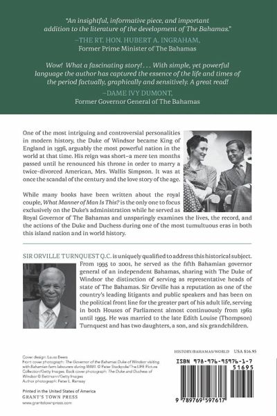 What Manner of Man Is This? is a unique and incisive look at an important but largely ignored period of the life of the Prince of Wales who was heir to the British throne and became King of England, Edward VIII, in 1936. A mere ten months later he abdicated the throne to marry a twice-divorced American, Mrs. Wallis Simpson in what was at once the scandal of the century and the love story of the age. Many books have been written about the royal couple, The Duke and Duchess of Windsor, but this focuses exclusively on The Duke's tenure as Royal Governor of The Bahamas in a tumultuous era during which major events and programs occurred including the murder of Sir Harry Oakes, the richest man in the British Empire at that time, all set against the backdrop of World War II raging in Europe. This book also stands apart from others because its author, Sir Orville Turnquest, speaks with the authority and credibility of someone who has occupied the very same office as the Duke of Windsor. Sir Orville did not, however, come from a royal or aristocratic family but rather, in sharp contrast to his predecessor, he came from an area of Nassau inhabited by the underprivileged black community and thus provides a perspective that could not be more different from those of a former King of England. What Manner of Man Is This? is an insider's look at a vital part of Bahamian history with the island nation's emergence from slavery and the African diaspora to a prominent role in world history. "To his credit, Turnquest has written a book that is not a sanitized biography of The Duke of Windsor but rather an incisive examination of a small but enormously important slice of the life of this notorious man, a former King of England. . . . Sir Orville Turnquest, orator, top litigator and esteemed elder statesman as former Governor General and head of state of The Bahamas, has shown the insight and courage to give his country and the world an extraordinary book about a man and a nation that converged at a critical time in global and Bahamian history." --Sir Sidney Poitier, from the Foreword of What Manner of Man Is This? "An insightful, informative book and important addition to the literature of the development of The Bahamas. . . . Turnquest has produced an easy, readable history of the period, well-informed by his own personal experience as a young black, who overcame the absence of opportunities gifted to the Duke of Windsor to become the Duke's successor in the office of Governor General of an independent Bahamas." --Rt. Hon. Hubert A. Ingraham, Former Prime Minister of The Bahamas "What a fascinating story! ...With simple, yet powerful language the author has captured the essence of the life and times of the period factually, graphically and senstively. A great read!!" --Dame Ivy Dumont, Former Governor General of The Bahamas "The elements could not be more conducive to a fascinating read: a world at war, a sleepy but strategically-located British colony, a great love story, a former king as governor of a tiny colony, the beginning of social upheaval. Sir Orville weaves all these elements together to produce a highly readable book." --Sir Arthur Foulkes, Former Governor General of The Bahamas www.grantstownpress.com