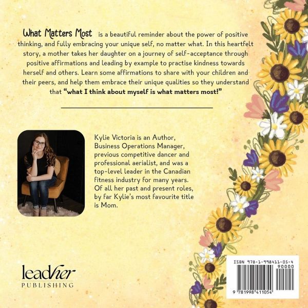 What Matters Most is a beautiful reminder about the power of positive thinking, and fully embracing your unique self, no matter what. In this heartfelt story, a mother takes her daughter on a journey of self-acceptance through positive affirmations and leading by example to practice kindness towards herself and others. Learn some affirmations to share with your children and their peers, and help them embrace their unique qualities so they understand that "what I think about myself is what matters most!" AFFIRMATION ACTIVITY INCLUDED ¿¿ Affirmations are statements that confirm a positive belief about yourself. It's easy to be too focused on the negative things in life, so it takes practice to pay close attention to the positive things instead. Affirmations often start with "I am..." and are written and spoken in the present tense (now) and not in the future tense (later). You can write or say your own personal affirmations every day! They are small actions that can make a big difference in how you feel about yourself and your abilities. Use the next page to write out your very own affirmations! Tear out the sheet and attach it to your bedroom wall or a mirror you see regularly. Repeat your affirmations every night before bed. Because...what matters most is the way you speak and think about yourself. -- Kylie Victoria is an Author, Business Operations Manager, previous competitive dancer, and professional aerialist, and was a top-level leader in the Canadian fitness industry for many years. Of all her past and present roles, by far Kylie's favorite title is Mom. Kylie is a mom to a 5-year-old daughter who was diagnosed with hip dysplasia at 18 months old. The strength, perseverance, and resilience she witnessed her daughter embody through 3 major hip surgeries have guided her life's purpose. Now, Kylie is a blessed mom of four, with one biological 5-year-old daughter, two stepsons aged 5 and 3, and a newborn baby boy! Kylie has a strong passion for nature and exploring all elements. Whether she is surrounded by trees in the forest, kayaking on the lake, or relaxing on a sandy beach, you'll find Kylie at peace doing something outside with her family. Published in partnership with LeadHer Publishing, a publishing agency for women who lead with their voice. Find out more at leadherpublishing.com