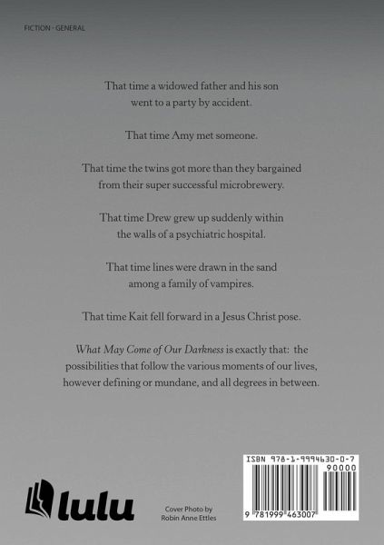 That time a widowed father and his son went to a party by accident. That time Amy met someone. That time the twins got more than they bargained from their super successful microbrewery. That time Drew grew up suddenly within the walls of a psychiatric hospital. That time lines were drawn in the sand among a family of vampires. That time Kait fell forward in a Jesus Christ pose. What May Come of Our Darkness is exactly that: the possibilities that follow the various moments of our lives, however defining or mundane, and all degrees in between.