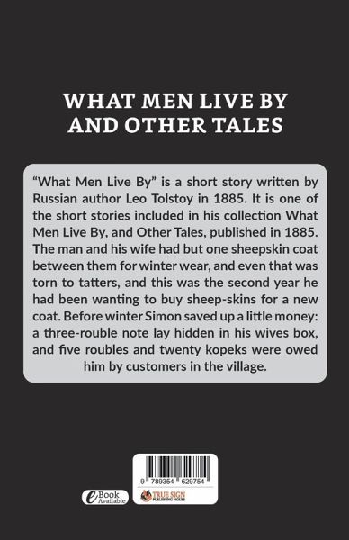 "What Men Live By" is a short story written by Russian author Leo Tolstoy in 1885. It is one of the short stories included in his collection What Men Live By, and Other Tales, published in 1885. The man and his wife had but one sheepskin coat between them for winter wear, and even that was torn to tatters, and this was the second year he had been wanting to buy sheep-skins for a new coat. Before winter Simon saved up a little money: a three-rouble note lay hidden in his wives box, and five roubles and twenty kopeks were owed him by customers in the village.