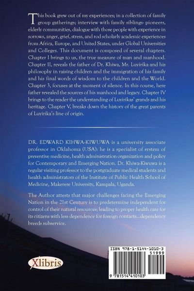 This book grew out of my experiences; in a collection of family group gatherings; interview with family siblings- pioneers, elderly communities, dialogue with those people with experience in sorrows, anger, grief, stress, and rod scholarly academic experiences from Africa, Europe, and United States, under Global Universities and Colleges. This document is composed of several chapters. Chapter I brings to us, the true measure of man and manhood. Chapter II, reveals the father of Dr. Khiwa, Mr. Luyirika and his philosophy in raising children and the immigration of his family and his final words of wisdom to the children and the World. Chapter 3, focuses at the moment of silence. In this course, here father revealed the sources of his manhood and legacy. Chapter IV brings to the reader the understanding of Luyirikas' grands and his heritage. Chapter V, breaks down the history of the great parents of Luyirika's line of origin.