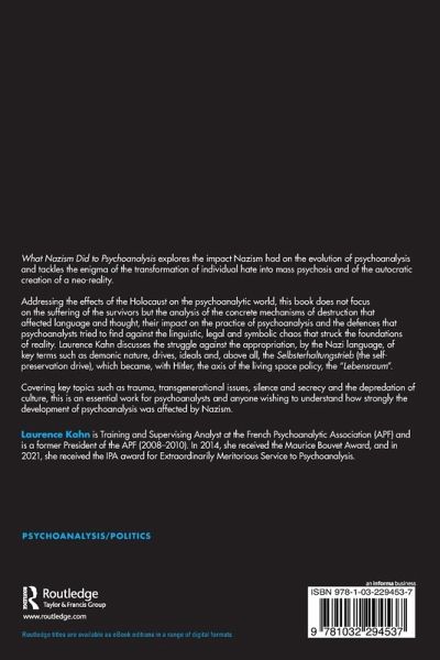 Addressing the effects of the Holocaust on the psychoanalytic world, this book does not focus on the suffering of the survivors but the analysis of the concrete mechanisms of destruction that affected language and thought, their impact on the practice of psychoanalysis and the defences that psychoanalysts tried to find against the linguistic, legal and symbolic chaos that struck the foundations of reality. Laurence Kahn discusses the struggle against the appropriation, by the Nazi language, of key terms such as demonic nature, drives, ideals and, above all, the Selbsterhaltungstrieb (the self-preservation drive), which became, with Hitler, the axis of the living space policy, the "Lebensraum".