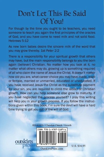 Don't Let This Be Said Of You! For though by the time you ought to be teachers, you need someone to teach you again the first principles of the oracles of God, and you have come to need milk and not solid food. Hebrews 5:12. As new born babes desire the sincere milk of the word that you may grow thereby. 1st Peter 2:2. There is a responsibility for your spiritual growth that others may have, but the main responsibility belongs to you the born again (believer) Christian. No matter how you look at it, no matter what others may do, growing up is something required of all who claim the name of Jesus the Christ. It doesn't matter how old you are, what career choice you may have made, male or female, married or unmarried, educated or uneducated. If you have received Jesus the Christ as the substitute payment for your sin, you are required to climb the ladder of Christian growth. How can you help someone else grow to maturity, if you have neglected the process yourself? I pray this writing will help you in your growth process. If you follow the instructions given within this book, I'm sure the devil will have a hard time trying to get you out of the will of God.