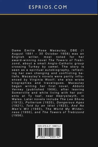 Dame Emilie Rose Macaulay, DBE (1 August 1881 - 30 October 1958) was an English writer, most noted for her award-winning novel The Towers of Trebizond, about a small Anglo-Catholic group crossing Turkey by camel. The story is seen as a spiritual autobiography, reflecting her own changing and conflicting beliefs. Macaulay's novels were partly influenced by Virginia Woolf; she also wrote biographies and travelogues. Macaulay began writing her first novel, Abbots Verney (published 1906), after leaving Somerville and while living with her parents at Ty Isaf, near Aberystwyth, in Wales. Later novels include The Lee Shore (1912), Potterism (1920), Dangerous Ages (1921), Told by an Idiot (1923), And No Man's Wit (1940), The World My Wilderness (1950), and The Towers of Trebizond (1956).