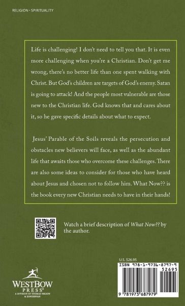 Life is challenging! I don't need to tell you that. It is even more challenging when you're a Christian. Don't get me wrong, there's no better life than one spent walking with Christ. But God's children are targets of God's enemy. Satan is going to attack! And the people most vulnerable are those new to the Christian life. God knows that and cares about it, so he gave specific details about what to expect. Jesus' Parable of the Soils reveals the persecution and obstacles new believers will face, as well as the abundant life that awaits those who overcome these challenges. There are also some ideas to consider for those who have heard about Jesus and chosen not to follow him. What Now?? is the book every new Christian needs to have in their hands!