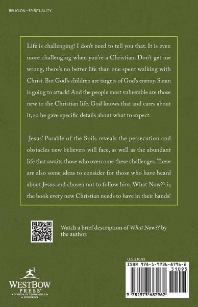 Life is challenging! I don't need to tell you that. It is even more challenging when you're a Christian. Don't get me wrong, there's no better life than one spent walking with Christ. But God's children are targets of God's enemy. Satan is going to attack! And the people most vulnerable are those new to the Christian life. God knows that and cares about it, so he gave specific details about what to expect. Jesus' Parable of the Soils reveals the persecution and obstacles new believers will face, as well as the abundant life that awaits those who overcome these challenges. There are also some ideas to consider for those who have heard about Jesus and chosen not to follow him. What Now?? is the book every new Christian needs to have in their hands!