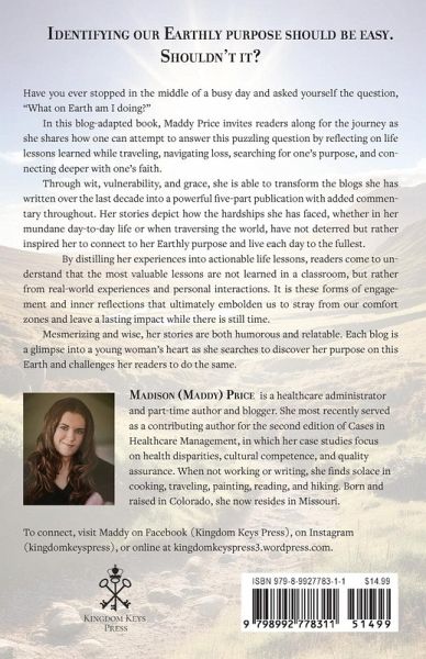 A memorable book filled with life lessons on how to remain resilient and keep a sense of humor during life's adventures and misadventures. Have you ever stopped in the middle of a busy day and asked yourself the question, "What on Earth am I doing?" In this blog-adapted book, Maddy Price invites readers along for the journey as she shares how one can attempt to answer this puzzling question by reflecting on life lessons learned while traveling, navigating loss, searching for one's purpose, and connecting deeper with one's faith. Through wit, vulnerability, and grace, she is able to transform the blogs she has written over the last decade into a powerful five-part publication with added commentary throughout. Her stories depict how the hardships she has faced, whether in her mundane day-to-day life or when traversing the world, have not deterred but rather inspired her to connect to her Earthly purpose and live each day to the fullest. By distilling her experiences into actionable life lessons, readers come to understand that the most valuable lessons are not learned in a classroom, but rather from real-world experiences and personal interactions. It is these forms of engagement and inner reflections that ultimately embolden us to stray from our comfort zones and leave a lasting impact while there is still time. Mesmerizing and wise, her stories are both humorous and relatable. Each blog is a glimpse into a young woman's heart as she searches to discover her purpose on this Earth and challenges her readers to do the same. Because after all, identifying our Earthly purpose should be easy... shouldn't it?