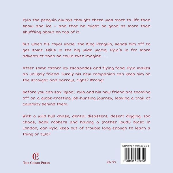 Pyla the penguin always thought there was more to life than snow and ice – and that he might be good at more than shuffling about on top of it. But when his royal uncle, the King Penguin, sends him off to get some skills in the big wide world, Pyla’s in for more adventure than he could ever imagine . . . After some rather icy escapades and flying food, Pyla makes an unlikely friend. Surely his new companion can keep him on the straight and narrow, right? Wrong! Before you can say ‘igloo’, Pyla and his new friend are zooming off on a globe-trotting job-hunting journey, leaving a trail of calamity behind them. With a wild bull chase, dental disasters, desert digging, zoo chaos, bank robbers and having a (rather loud!) blast in London, can Pyla keep out of trouble long enough to learn a thing or two?