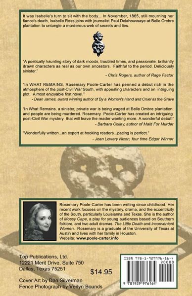 Rosemary Poole-Carter explores aspects of an uneasy past in her novels Only Charlotte, Women of Magdalene, What Remains, and Juliette Ascending, all set in the post-Civil War South. Her plays include The Familiar, a ghost story, and The Little Death, a Southern gothic drama. Fascinated by history, mystery, and the performing and visual arts, she is a member of the Historical Novel Society, Mystery Writers of America, and the Dramatists Guild of America. A graduate of the University of Texas at Austin, she was a long-time resident of Houston, where she practiced her devotion to reading and writing with students of the Lone Star College System. She now lives and writes by the Eno River in Durham, North Carolina.