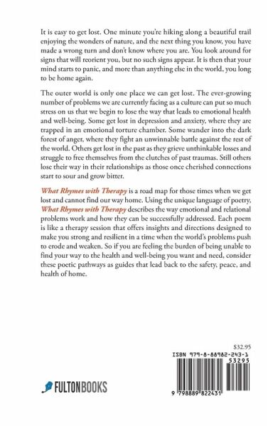 It is easy to get lost. One minute you're hiking along a beautiful trail enjoying the wonders of nature, and the next thing you know, you have made a wrong turn and don't know where you are. You look around for signs that will reorient you, but no such signs appear. It is then that your mind starts to panic, and more than anything else in the world, you long to be home again. The outer world is only one place we can get lost. The ever-growing number of problems we are currently facing as a culture can put so much stress on us that we begin to lose the way that leads to emotional health and well-being. Some get lost in depression and anxiety, where they are trapped in an emotional torture chamber. Some wander into the dark forest of anger, where they fight an unwinnable battle against the rest of the world. Others get lost in the past as they grieve unthinkable losses and struggle to free themselves from the clutches of past traumas. Still others lose their way in their relationships as those once cherished connections start to sour and grow bitter. What Rhymes with Therapy is a road map for those times when we get lost and cannot find our way home. Using the unique language of poetry, What Rhymes with Therapy describes the way emotional and relational problems work and how they can be successfully addressed. Each poem is like a therapy session that offers insights and directions designed to make you strong and resilient in a time when the world's problems push to erode and weaken. So if you are feeling the burden of being unable to find your way to the health and well-being you want and need, consider these poetic pathways as guides that lead back to the safety, peace, and health of home.