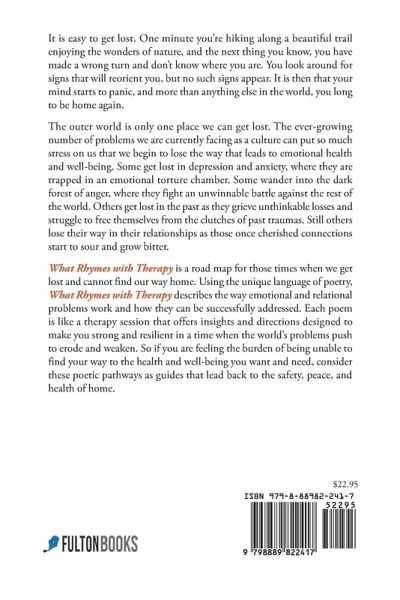 It is easy to get lost. One minute you're hiking along a beautiful trail enjoying the wonders of nature, and the next thing you know, you have made a wrong turn and don't know where you are. You look around for signs that will reorient you, but no such signs appear. It is then that your mind starts to panic, and more than anything else in the world, you long to be home again. The outer world is only one place we can get lost. The ever-growing number of problems we are currently facing as a culture can put so much stress on us that we begin to lose the way that leads to emotional health and well-being. Some get lost in depression and anxiety, where they are trapped in an emotional torture chamber. Some wander into the dark forest of anger, where they fight an unwinnable battle against the rest of the world. Others get lost in the past as they grieve unthinkable losses and struggle to free themselves from the clutches of past traumas. Still others lose their way in their relationships as those once cherished connections start to sour and grow bitter. What Rhymes with Therapy is a road map for those times when we get lost and cannot find our way home. Using the unique language of poetry, What Rhymes with Therapy describes the way emotional and relational problems work and how they can be successfully addressed. Each poem is like a therapy session that offers insights and directions designed to make you strong and resilient in a time when the world's problems push to erode and weaken. So if you are feeling the burden of being unable to find your way to the health and well-being you want and need, consider these poetic pathways as guides that lead back to the safety, peace, and health of home.