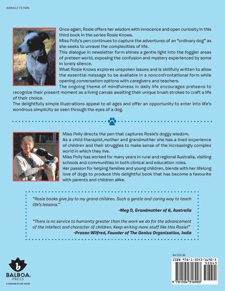 Once again, Rosie offers her wisdom with innocence and open curiosity in this third book in the series Rosie Knows. Miss Polly's pen continues to capture the adventures of an "ordinary dog" as she seeks to unravel the complexities of life. This dialogue in newsletter form shines a gentle light into the foggier areas of preteen world, exposing the confusion and mystery experienced by some in lonely silence. What Rosie Knows explores unspoken issues and is skillfully written to allow the essential message to be available in a nonconfrontational form while opening conversation options with caregivers and teachers. The ongoing theme of mindfulness in daily life encourages preteens to recognize their present moment as a living canvas awaiting their unique brush strokes to craft a life of their choice. The delightfully simple illustrations appeal to all ages and offer an opportunity to enter into life's wondrous simplicity as seen through the eyes of a dog.