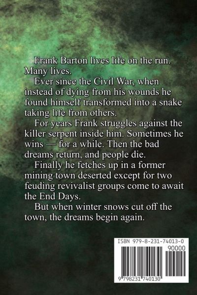 Frank Barton lives life on the run. Many lives. Ever since the Civil War, when instead of dying from his wounds he found himself transformed into a snake crawling across the battlefield, absorbing life from others. For years Frank struggles against the killer serpent inside him that won't let him die or grow old. Sometimes, for a while, he wins. Then the bad dreams return, people die ... and he flees yet another attempt to build a normal life. Now in 1912 he's finally found the precise middle of nowhere -- Bride's Creek, a former mining town deserted after a series of gruesome murders years before. Perfect. Or it would be, except for the two feuding revivalist groups come to await the End Days foretold in Revelations. Worse, Frank falls for the fiery preacher who leads one of them, even knowing the serpent is a jealous god. Then winter snows cut off the town, and the dreams and the killings begin again.