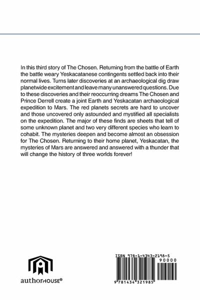 In this third story of The Chosen. Returning from the battle of Earth the battle weary Yeskacatanese contingents settled back into their normal lives. Turns later discoveries at an archaeological dig draw planetwide excitement and leave many unanswered questions. Due to these discoveries and their reoccurring dreams The Chosen and Prince Derrell create a joint Earth and Yeskacatan archaeological expedition to Mars. The red planets secrets are hard to uncover and those uncovered only astounded and mystified all specialists on the expedition. The major of these finds are sheets that tell of some unknown planet and two very different species who learn to cohabit. The mysteries deepen and become almost an obsession for The Chosen. Returning to their home planet, Yeskacatan, the mysteries of Mars are answered and answered with a thunder that will change the history of three worlds forever!