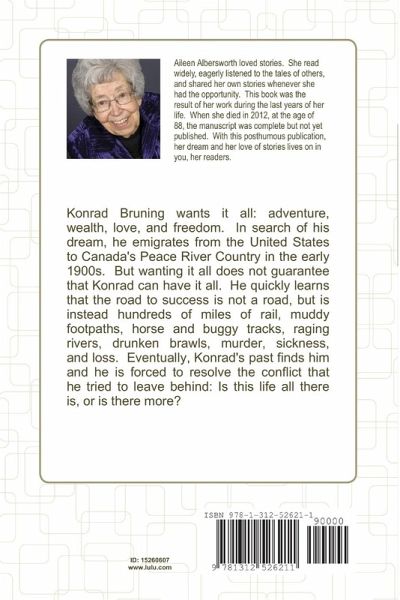 Konrad Bruning wants it all: adventure, wealth, love, and freedom. In search of his dream, he emigrates from the United States to Canada's Peace River Country in the early 1900s. But wanting it all does not guarantee that Konrad can have it all. Konrad quickly learns that the road to success is not a road, but is instead hundreds of miles of rail, muddy footpaths, horse and buggy tracks, raging rivers, drunken brawls, murder, sickness, and loss. Eventually, Konrad's past finds him and he is forced to resolve the conflict that he tried to leave behind: Is this life all there is, or is there more?